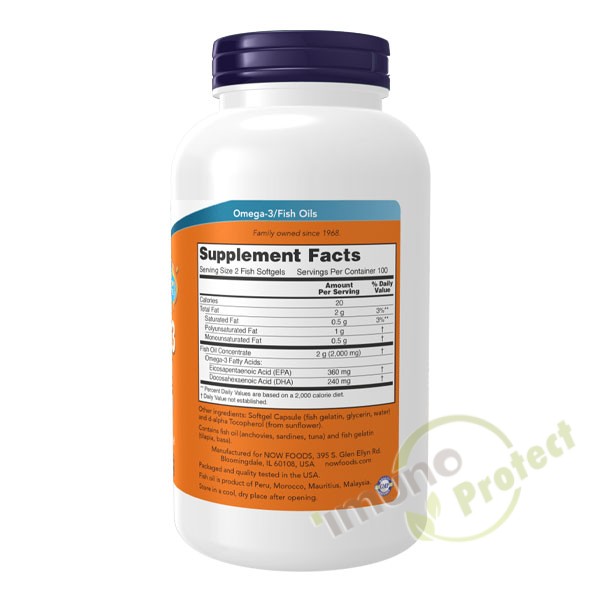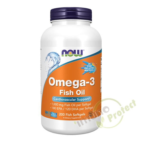 NOW Foods Omega-3 molekularno destilirano riblje ulje (200 mekih kapsula) sadrži 1000 mg ribljeg ulja po mekoj kapsuli, uključujući 180 mg EPA i 120 mg DHA. Meke kapsule su napravljene od riblje želatine. Ovo riblje ulje testirano je na onečišćujuće tvari poput PCB-a, dioksina, žive i drugih teških metala. Riblje ulje dobiva se iz inćuna, sardina i tune, a pakirano je i testirano u SAD-u.