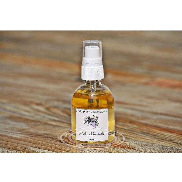 Sprej protiv komaraca na bazi hidrolata lavande, maslinovog ulja koje ce ciniti kozu meksom, eteričnog ulja limunske trave, citronele i visokog udjela etericnog ulja lavandina za taj famozni miris koji krvopije ne podnose.