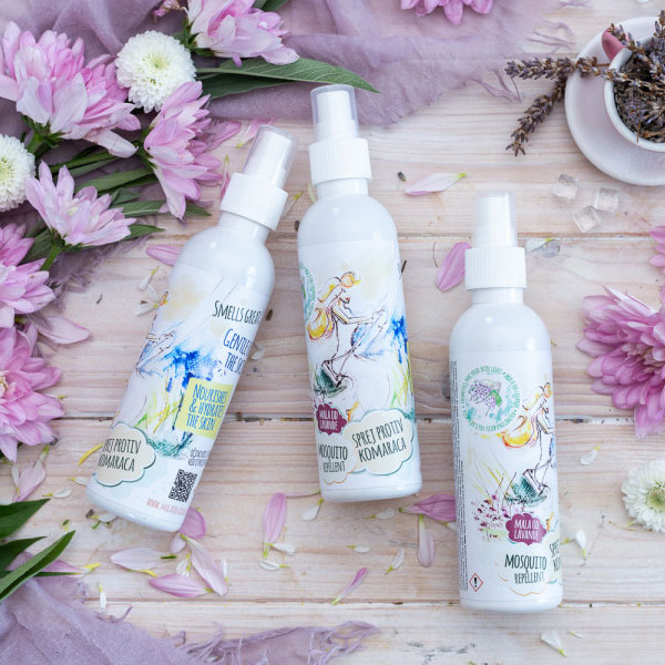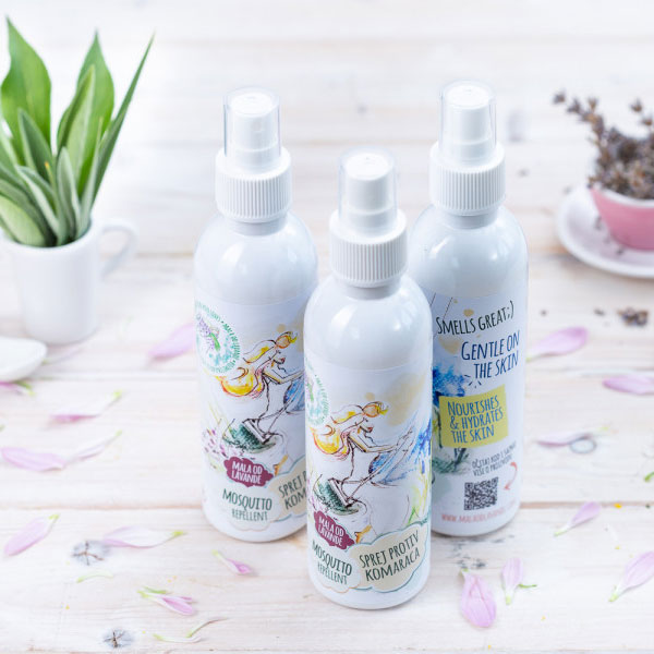 Sprej protiv komaraca sastavljen je 100% prirodno, na bazi hidrolata lavandina koji umiruje svaku kožu, suncokretovog ulja koje ce ciniti kozu meksom, nahraniti je i zadržati miris spreja, te kombinacije eteričnog ulja limunske trave, citronele i etericnog ulja lavandina koja daju ovom proizvodu predivan svježi miris koji smeta komarcima.