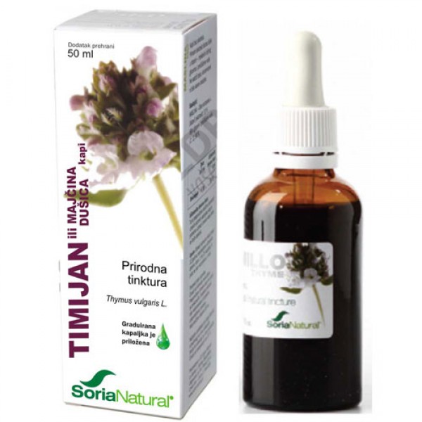Soria Natural Timijan (Thymus vulgaris L) je prirodna tinktura od listova biološki uzgojene biljke timijan (ili majčina dušica) u obliku peroralnih kapi. Biljka je iz čiste proizvodnje kod koje nisu upotrijebljena nikakva anorganska gnojiva, herbicidi ili pesticidi.