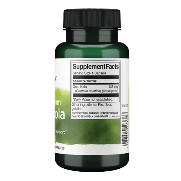 Swanson Gotu Kola je potpuno prirodan biljni pripravak koji doprinosi osvježenju mozga i tijela. Kod ayurvedskih praktičara stoljećima se koristi kao tonik za pamćenje, a zadnjih desetljeća našla je primjenu diljem svijeta kao način promicanja zdrave cirkulacije i jačanja opće vitalnosti. Svaka kapsula sadrži 435 mg čistog praha biljke gotu kole.