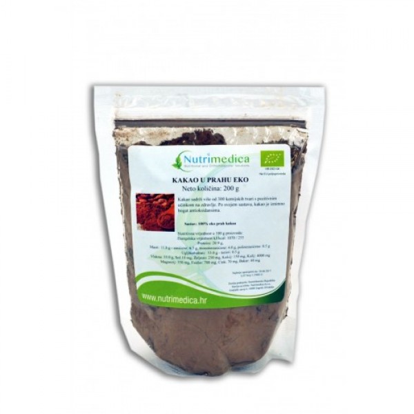 Oznake: Eko kakao u prahu, 200 g, kakao zrna, sirovi kakao, visok sadržaj antioksidansa, bez šećera, bez glutena, ne sadrži mlijeko, nizak glikemijski indeks, stres, koncentracija, depresija